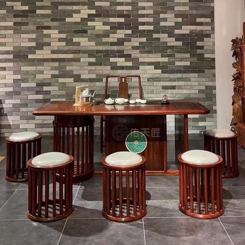 Klassieke theetafel in Chinese stijl van palissanderhout is een leefgebied voor de ziel en een verzamelplaats voor vriendschap. Zet hier een pot geurige thee en proef de rust en schoonheid van het leven. Voel de overvloeiende theegeur van de tijd en geniet van een moment van ontspanning. Het is zorgvuldig gemaakt van ebbenhout en komt uit de Chuantianjiang Redwood Factory. Maak het leven smaakvoller en de tijd poëtischer. De theetafel is flexibel aan te passen en de fauteuils en krukken kunnen naar behoefte worden gecombineerd.