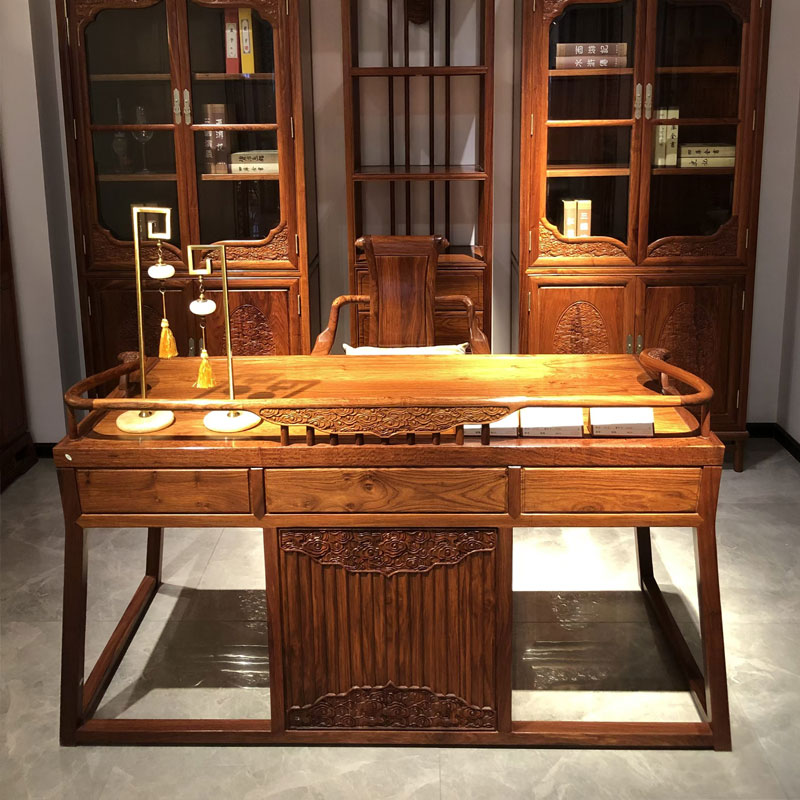 Als professionele fabrikant willen wij u een bureau van massief hout in klassieke stijl van hoge kwaliteit bieden. Dit product is zorgvuldig vervaardigd door de fabriek in Chuantianjiang. Met zijn uitstekende kwaliteit, uniek ontwerp en voortreffelijk vakmanschap is het de beste keuze voor je studie geworden. Het is gemaakt van egelrood sandelhout, een kostbaar geschenk dat de natuur ons geeft. Egelrood sandelhout heeft een harde textuur, een fijne en mooie textuur, als een boekrol die zorgvuldig door de natuur is getekend, en elke lijn bevat sporen en verhalen van de jaren. De kleur is diep en warm en straalt een eenvoudige en elegante sfeer uit, waardoor mensen erdoor gefascineerd raken.